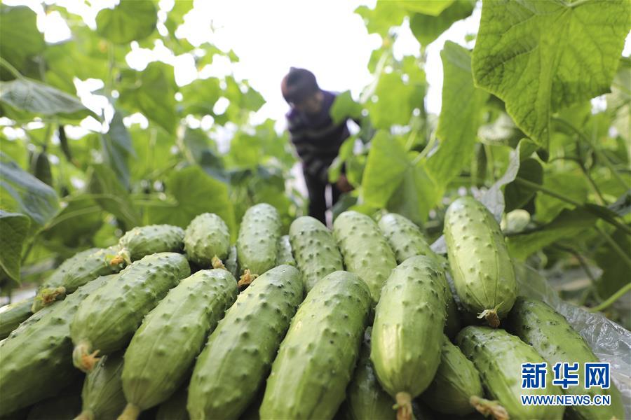 2月22日,河北省唐山市丰润区王官营镇皈依寨村农民在蔬菜大棚里收获黄瓜。 新华社发(刘满仓 摄)