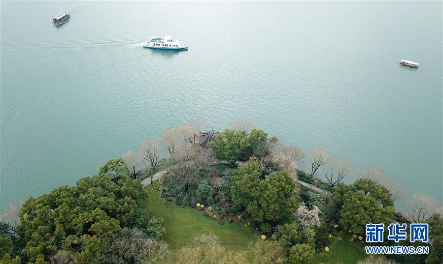 2月22日,游人在西湖上乘船观光(无人机拍摄)。新华社记者 翁忻旸 摄
