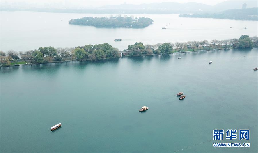 2月22日,游人在西湖上乘船观光(无人机拍摄)。 新华社记者 翁忻旸 摄