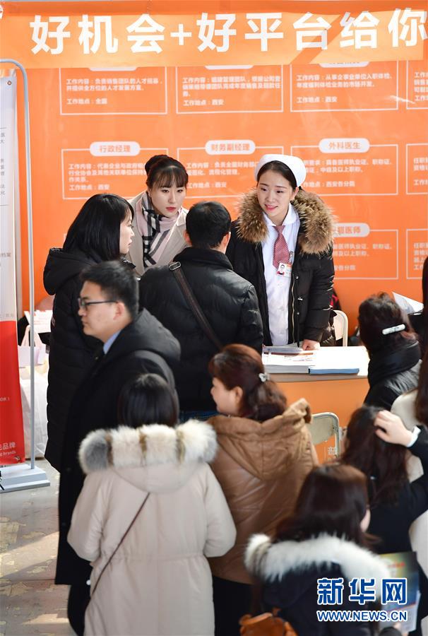 2月23日,在位于西安曲江国际会展中心的双选会主会场内,招聘企业工作人员在与求职者交流。 新华社记者 邵瑞 摄