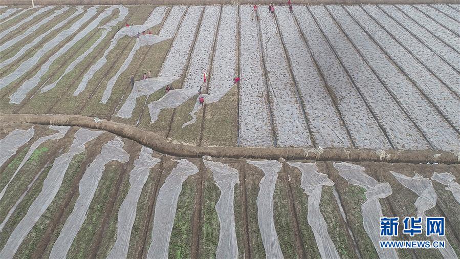 2月24日,江苏省灌云县南岗乡岗东村,农民在田间忙碌(无人机拍摄)。 新华社发(吴晨光 摄)