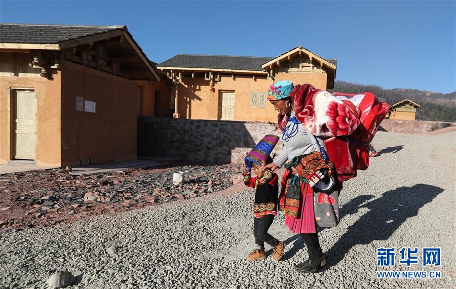 在昭觉县三河村易地扶贫安置点,马海阿依带着女儿搬进新居(2月11日摄)。2月11日,三河村首批29户、168人告别居住多年的土坯房,搬入易地扶贫安置点的新家。新华社记者 江宏景 摄