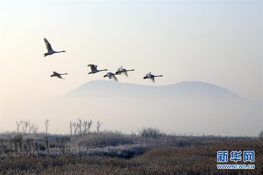 2月24日,大天鹅在山东荣成天鹅湖上空飞翔。 新华社发(王福东 摄)
