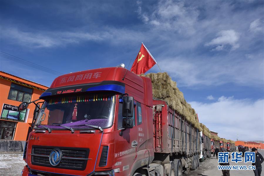 2月22日,在青海省玉树藏族自治州称多县清水河镇,几辆满载饲草料的救灾卡车整装待发。新华社记者吴刚摄