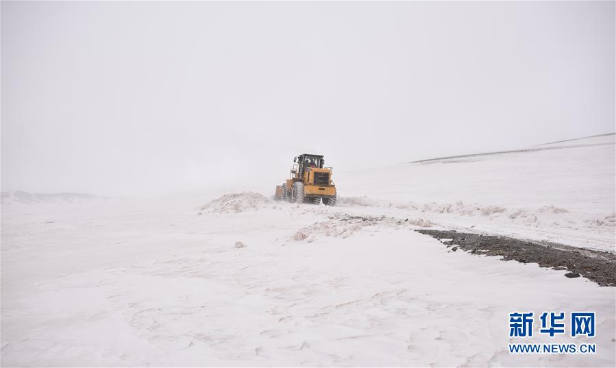 2月23日,在青海省玉树藏族自治州称多县扎朵镇治多村,一辆装载机在清除路面积雪。新华社记者吴刚摄