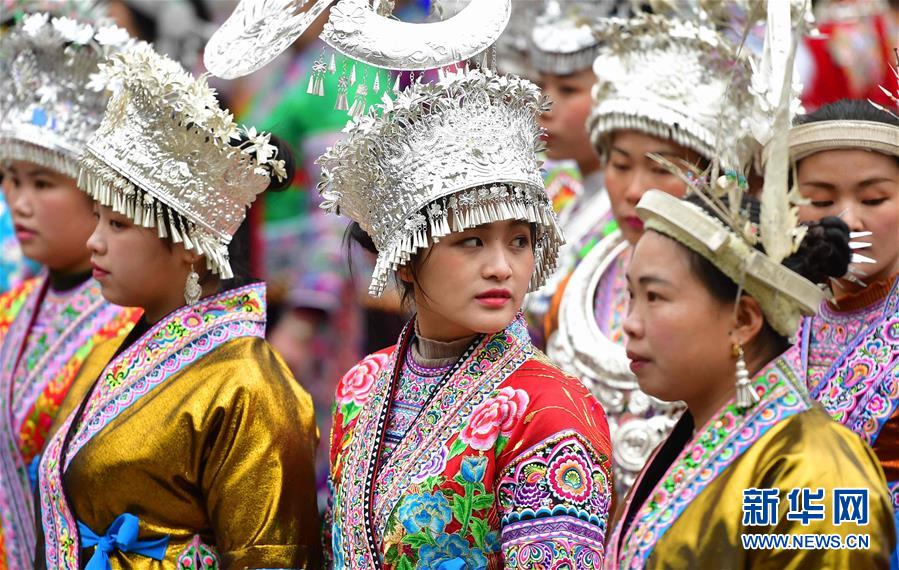 在广西融水苗族自治县香粉乡中坪村毛坪屯,苗家姑娘在坡会上表演(2月23日摄)。新华社记者黄孝邦摄
