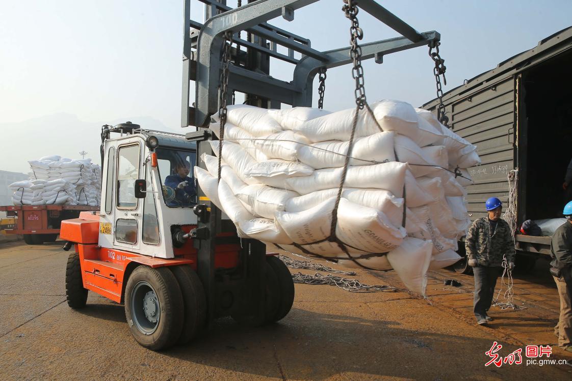 2019年2月24日,码头工人在吊装转运从火车上卸下的春耕化肥。