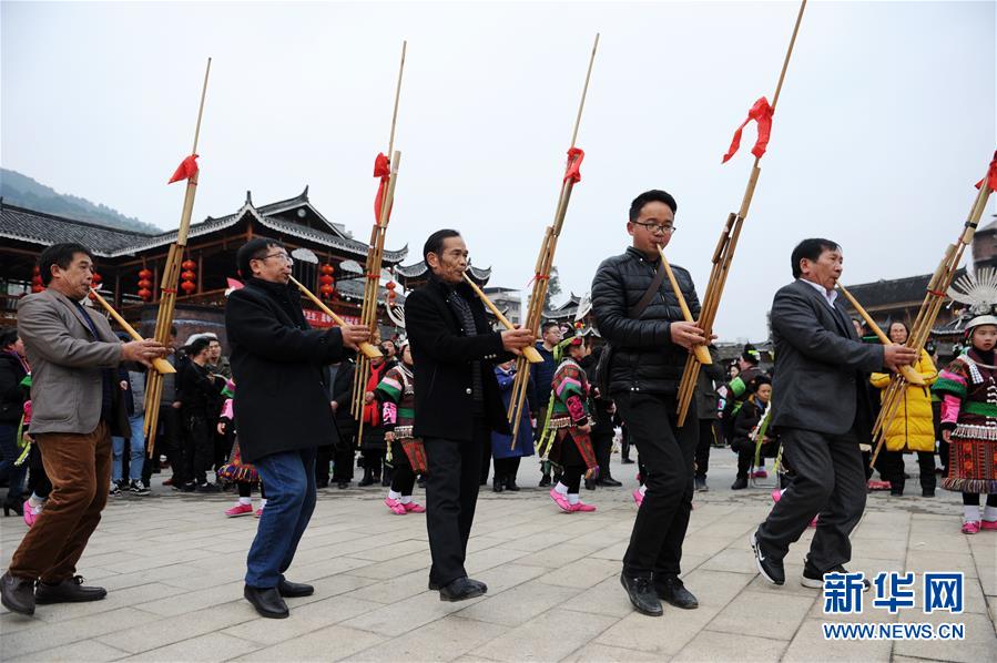 2月24日,在贵州省凯里市舟溪镇,苗族群众在吹奏芦笙。 当日,在贵州省黔东南苗族侗族自治州凯里市舟溪镇,来自各地的苗族群众身着节日盛装,欢聚在古老的“甘囊香”芦笙堂,男子吹奏起芦笙,姑娘和孩子们跳起芦笙舞,欢度新春,祈求风调雨顺、五谷丰登,青年男女也借此良日寻觅意中人。 “甘囊香”是苗语音译,意思为“河流的下游,神仙汇聚的地方”。“甘囊香”芦笙会是贵州规模最大、最古朴的苗族芦笙会之一。 新华社记者杨文斌摄