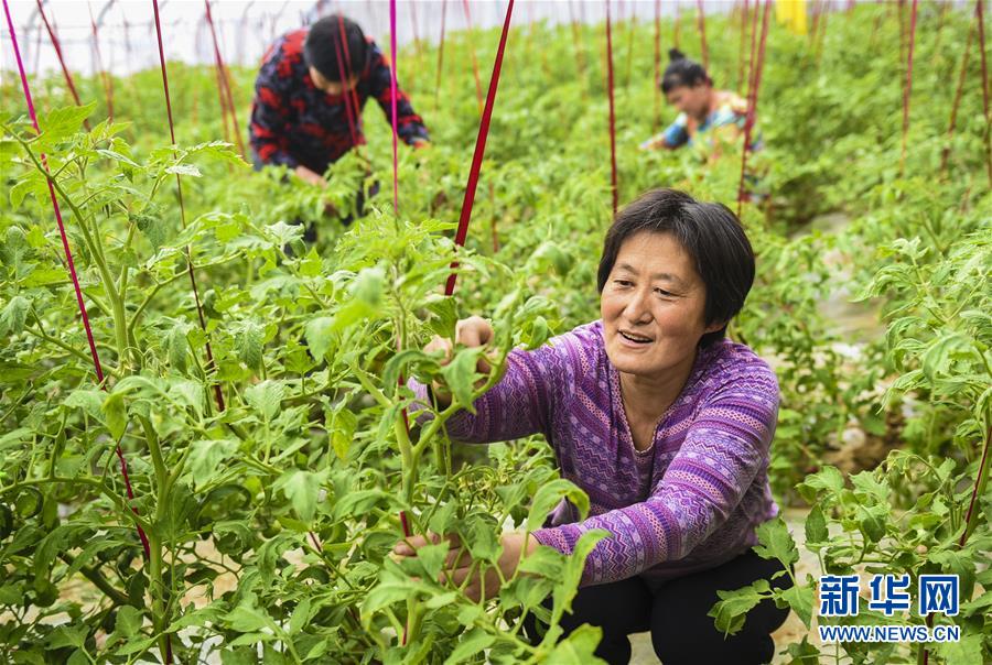2月24日,在位于深州的河北兴泰现代农业园区温室大棚内,工作人员为西红柿成苗整枝。新华社记者李晓果摄