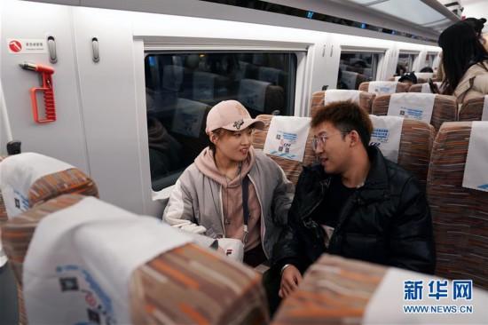 2月22日晚,张世玉(左)与吕新在北京南站登上回天津的列车。 新华社记者 鞠焕宗 摄