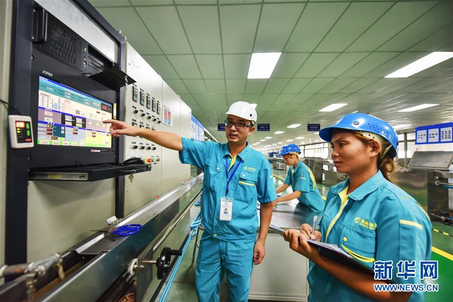 在泰国的罗勇工业园,中国籍的生产技术部部长吴海胜(左)在富通集团(泰国)通信技术有限公司对一名泰国籍工人进行技术指导(2015年5月11日摄)。 新华社记者 李芒茫摄