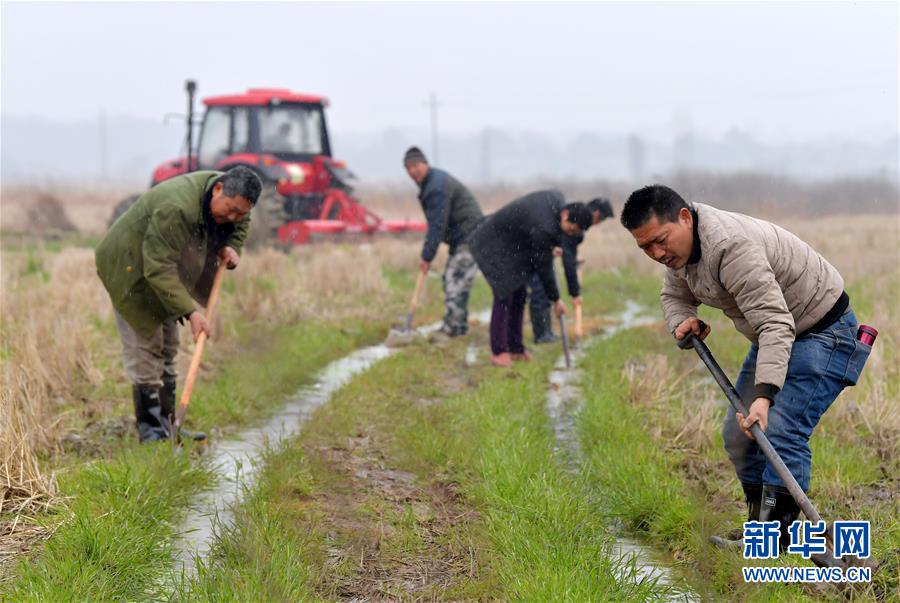 2月26日,在南昌市新建区留田村,农户在清排田间积水。 近日,江西南昌市新建区各乡镇组织农技人员下到田间地头,协助农户为春耕春播做准备。 新华社记者 彭昭之摄