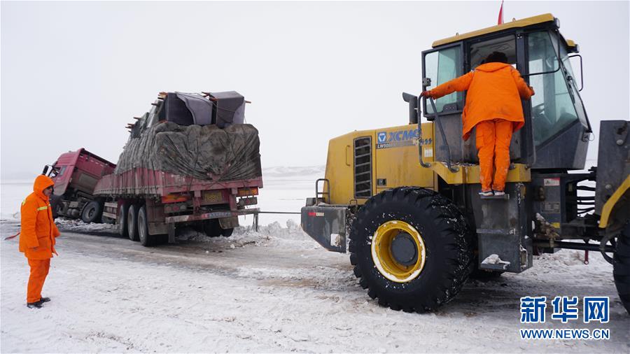 2月25日,青海省杂多公路段工作人员用装载车拖出侧滑到路边的半挂卡车。 新华社记者 李亚光摄