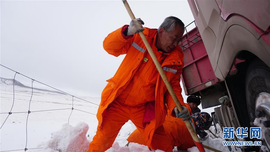 2月25日,青海省杂多公路段段长穆河翼在救援侧滑到路边的半挂卡车。 新华社记者 李亚光摄