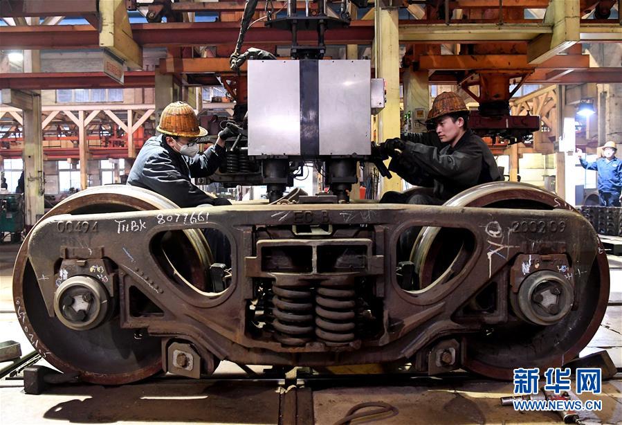 2月26日,中国铁路郑州局集团有限公司郑州北车辆段修车车间职工对检修完毕的列车转向架下心盘螺栓进行组装。 新华社记者李安摄