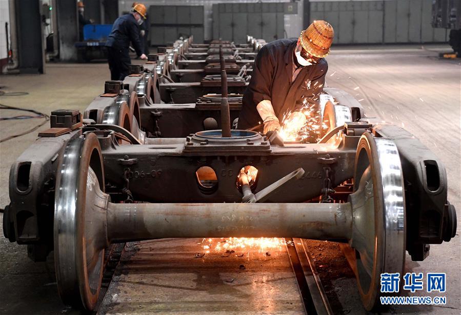 2月26日,中国铁路郑州局集团有限公司郑州北车辆段修车车间职工对列车转向架上的配件进行氧气切割。 新华社记者李安摄