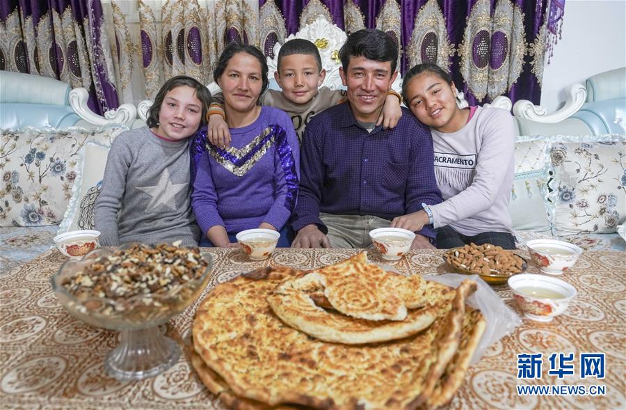 在位于新疆喀什地区泽普县桐安乡移民新村的新家中,热娜古丽·喀尔曼(左二)与家人一起准备吃早饭(2月17日摄)。