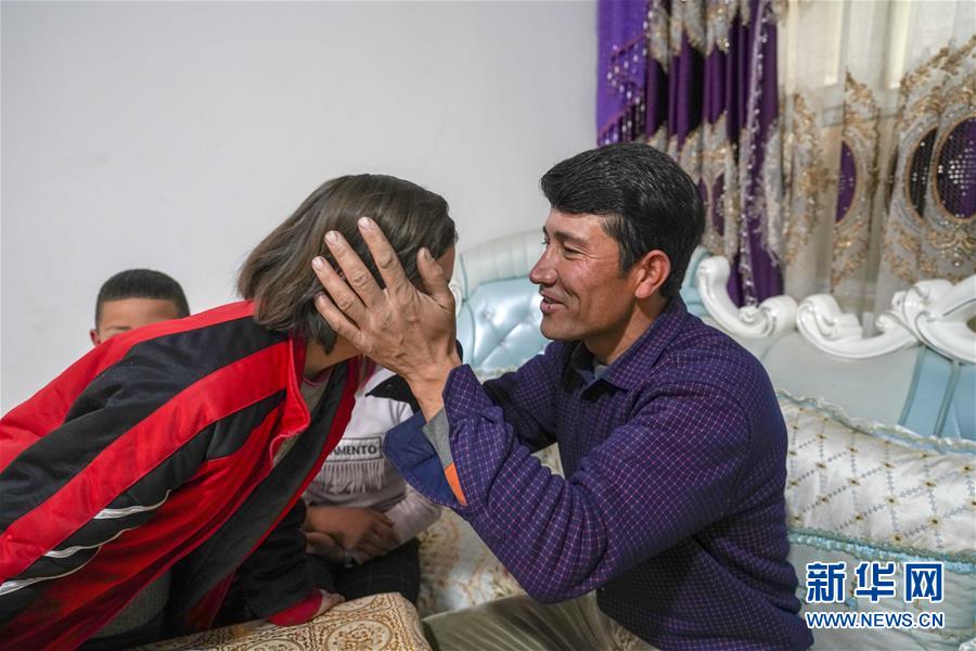 在位于新疆喀什地区泽普县桐安乡移民新村的新家中,热娜古丽·喀尔曼的丈夫买合肉甫·木拉吧(右)与孩子打招呼(2月17日摄)。 新华社记者 赵戈 摄