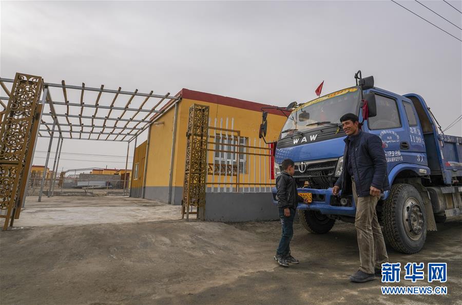 在新疆喀什地区泽普县桐安乡移民新村,热娜古丽·喀尔曼的丈夫买合肉甫·木拉吧(右)结束工作后返回家中(2月17日摄)。 新华社记者 赵戈 摄