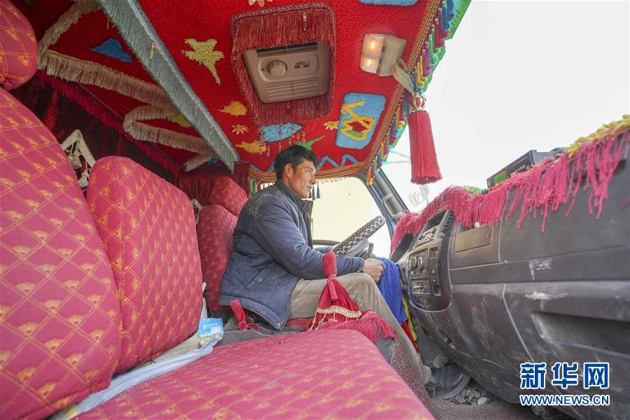 在新疆喀什地区泽普县桐安乡移民新村,热娜古丽·喀尔曼的丈夫买合肉甫·木拉吧驾驶卡车准备去拉货(2月17日摄)。 新华社记者 赵戈 摄