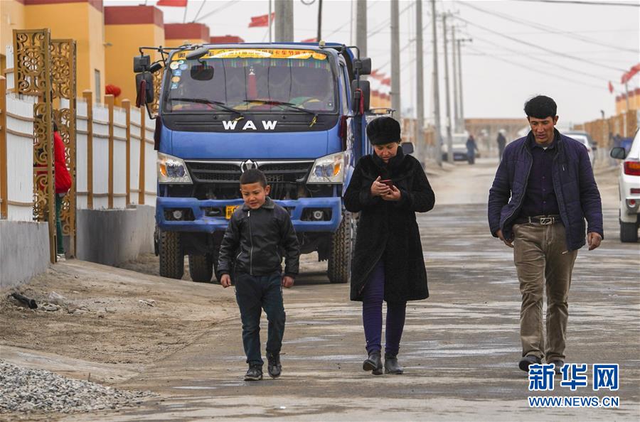 在新疆喀什地区泽普县桐安乡移民新村,热娜古丽·喀尔曼(中)和丈夫买合肉甫·木拉吧(右)与小儿子前往乡政府办事(2月17日摄)。 新华社记者 赵戈 摄