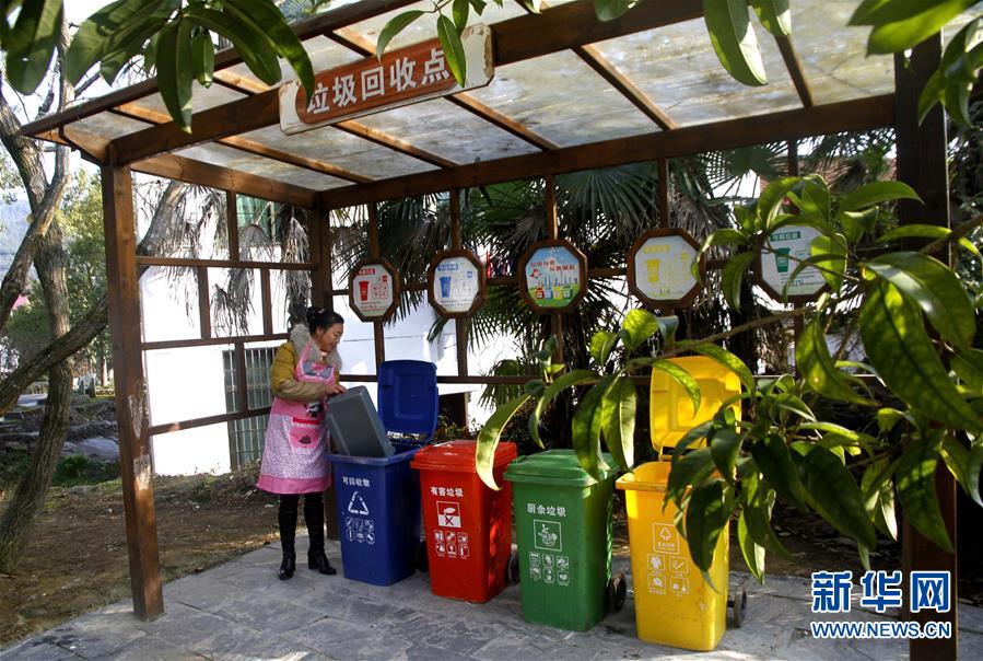 村民在江西省靖安县高湖镇古楠村垃圾回收点分类倾倒垃圾(2019年1月23日摄)。 新华社发(徐仲庭 摄)