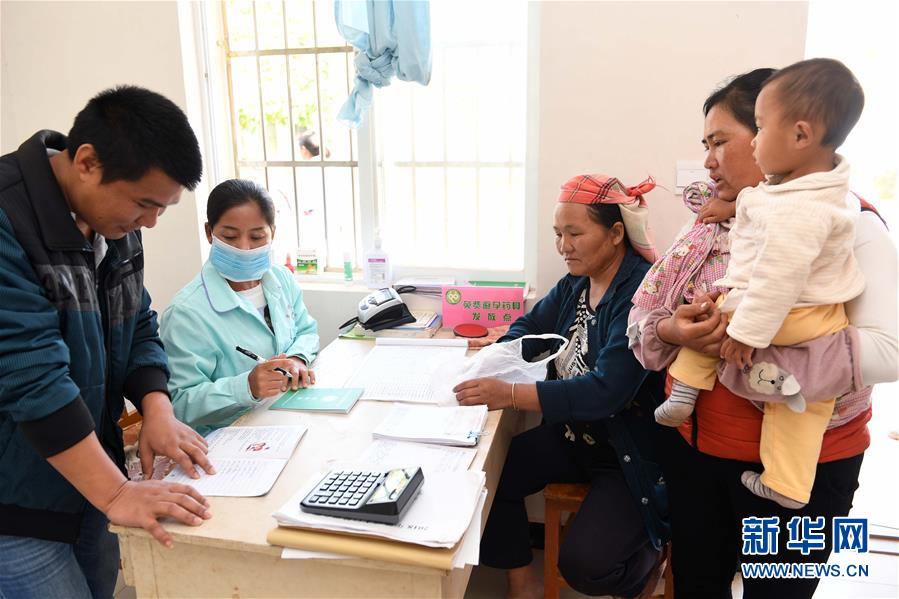 在云南省澜沧拉祜族自治县酒井乡岩因村,村医张惠仙(左二)在村卫生室接待前来看病的村民(2018年11月28日摄)。 新华社记者 杨宗友 摄