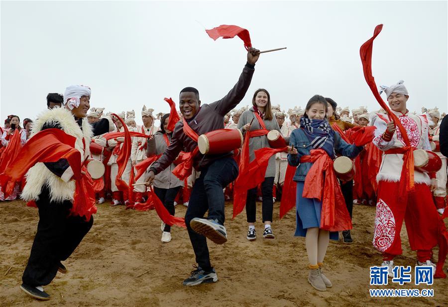 在位于黄土高原腹地的陕西省延安市安塞区高桥镇南沟村,一场腰鼓演出结束后,外国留学生与当地腰鼓手一起打腰鼓(2018年10月20日摄)。 新华社记者 刘潇 摄