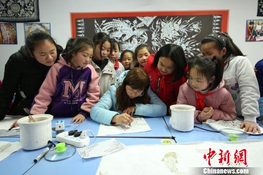 图为美术老师在给兴趣班的学生示范“苗族蜡染”的绘画步骤。 黄晓海 摄