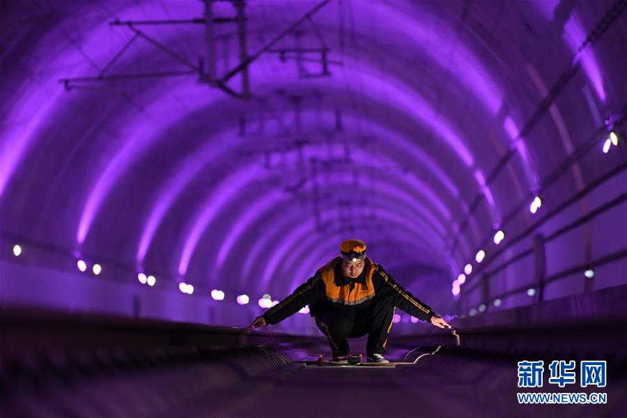 2月28日凌晨,西安电务段鄠邑电务车间信号工王超在西成高铁纸坊一号隧道里进行轨道电路测试。 新华社记者 李一博 摄