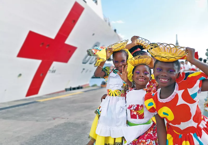 中国将以更负责的精神、更开放包容的胸襟、更高质量的增长,在实现自身发展的同时,为世界各国共同繁荣作出更大贡献。图为2018年10月22日,在安提瓜和巴布达首都圣约翰,当地小朋友身穿传统服装欢迎中国海军和平方舟医院船首次到访。 新华社发 江山/摄