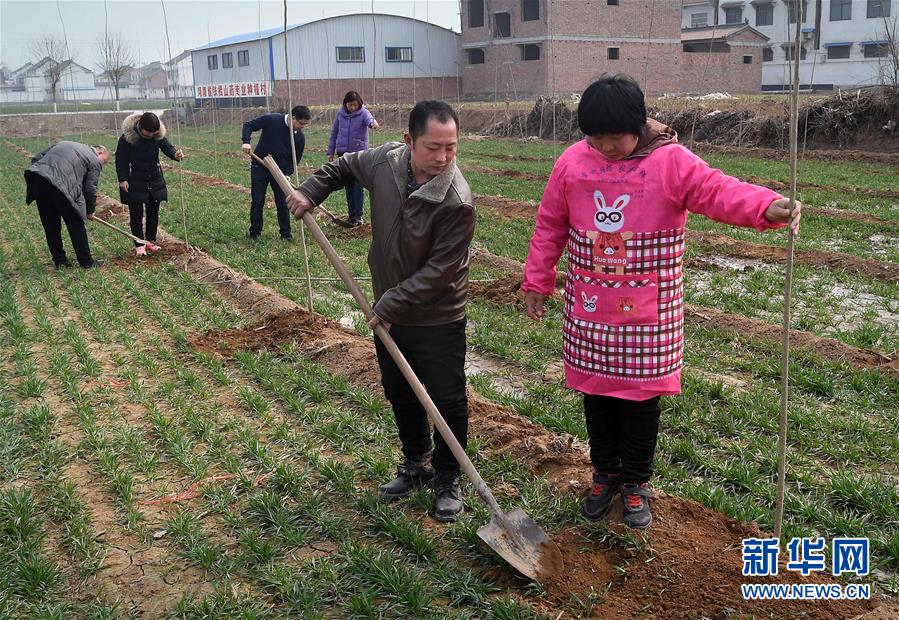 2月28日,王月季(右)和丈夫在韩郭作村里植树。 新华社记者 李安 摄
