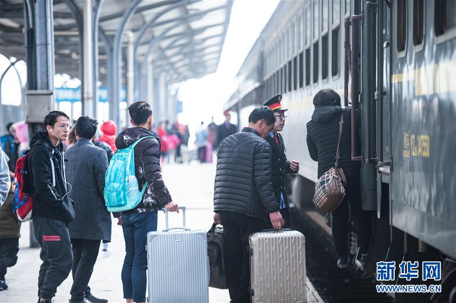 3月1日,旅客在贵州六枝火车站排队上车。 当日是2019年春运的最后一天,为期40天的2019年春运落下帷幕。 新华社记者 陶亮 摄