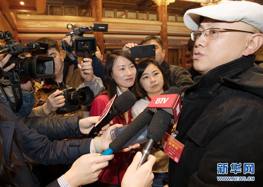 3月3日,北京代表团的全国人大代表戴天方在北京会议中心签到后接受采访。 新华社记者 金立旺 摄