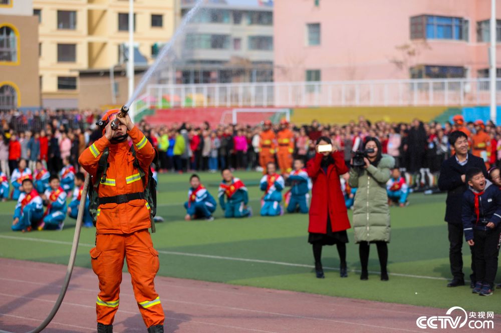 甘肃省森林消防总队张掖市支队指战员为张掖甘州区北街小学师生们演示泵车结合科目。