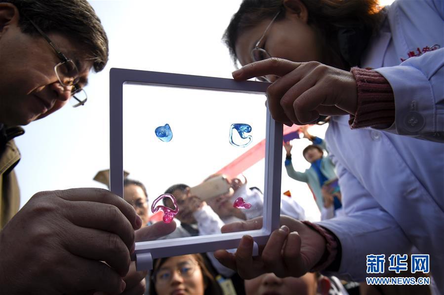 3月3日,医务人员在活动现场展示听力辅具。 新华社发(冯开华 摄)