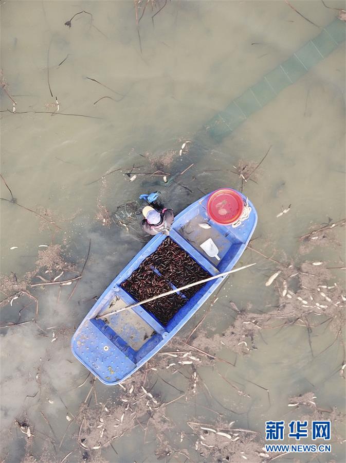 3月4日,江苏省淮安市洪泽区东双沟镇养殖户在采收小龙虾(无人机拍摄)。 初春时节,江苏省淮安市洪泽区东双沟镇藕虾套养的小龙虾喜获丰收,养殖户们忙着采收和分拣,准备投放市场。 新华社发(万震 摄)
