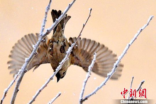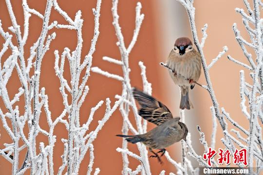 麻雀在雾凇枝头时而飞,时而停留。 闵勇 摄
