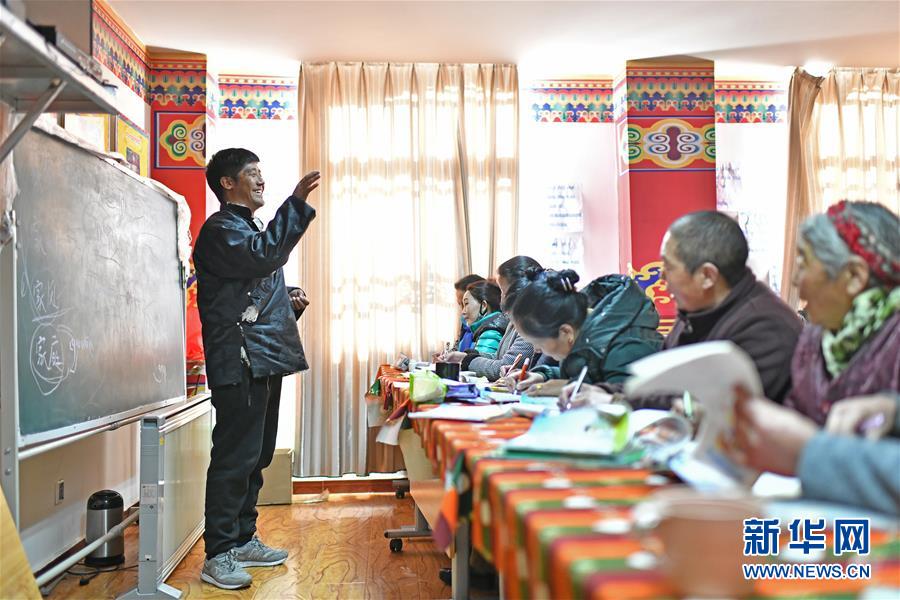 3月4日,在拉萨市城关区夏萨苏社区的群众文化室内,丹增(左一)给社区居民上文化课。2012年毕业于西藏大学的丹增,从2016年开始坚持给西藏拉萨市城关区夏萨苏社区的居民教授文化课。学员大多数是没有上过学的老年人,他们从藏文最基础的字母和汉字最简单的笔画学起,老师讲得认真风趣,学员学得津津有味。新华社记者 李鑫 摄
