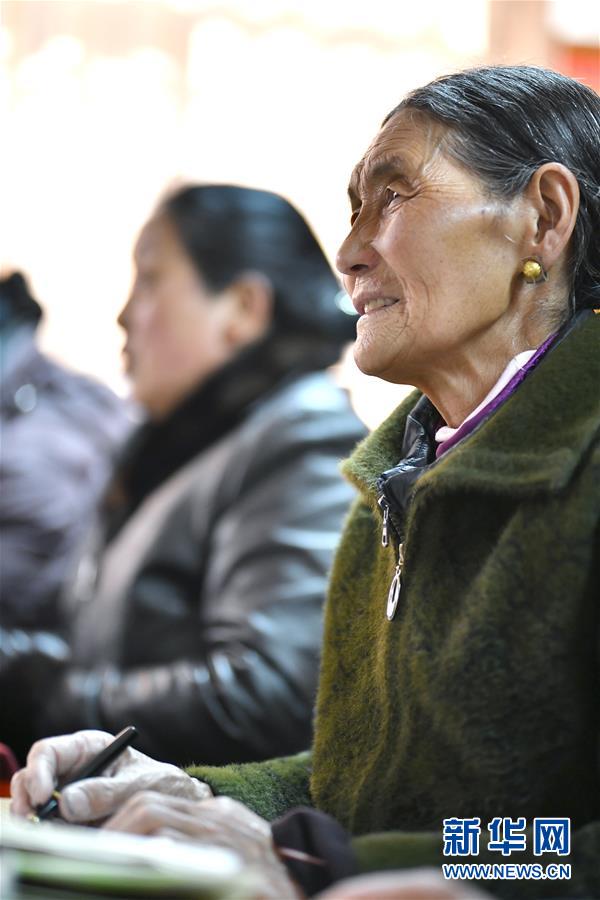 3月4日,社区居民在拉萨市城关区夏萨苏社区的群众文化室内听课。2012年毕业于西藏大学的丹增,从2016年开始坚持给西藏拉萨市城关区夏萨苏社区的居民教授文化课。学员大多数是没有上过学的老年人,他们从藏文最基础的字母和汉字最简单的笔画学起,老师讲得认真风趣,学员学得津津有味。新华社记者 李鑫 摄
