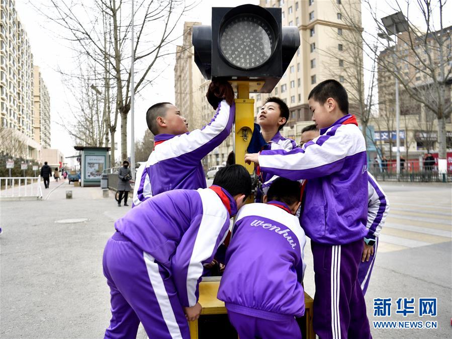 3月4日,青海省西宁市文汇小学启动“心存大爱学雷锋,从我做起见行动”主题教育活动,学生在学校附近清洁交通信号灯。