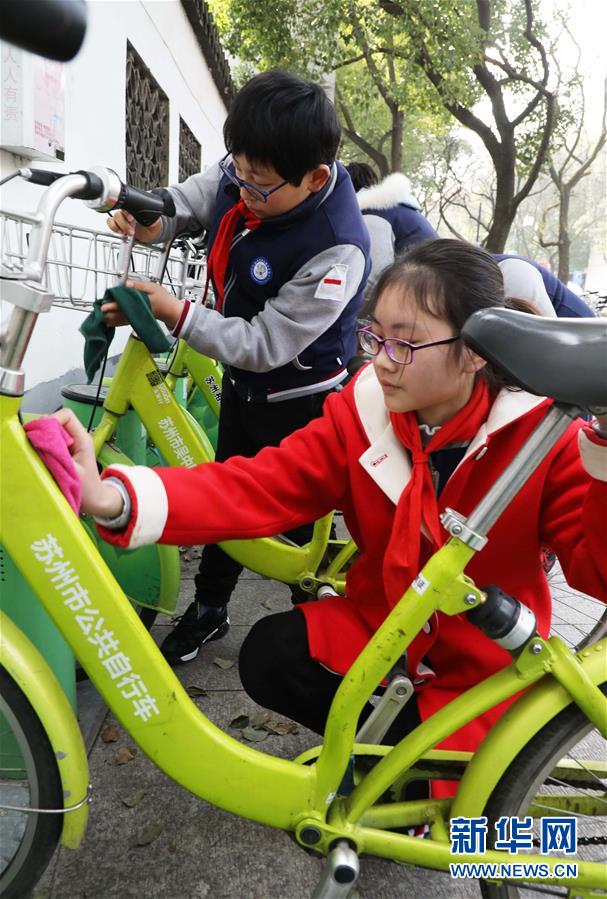 3月4日,江苏省苏州市东大街小学的学生在街头清洁公共自行车。