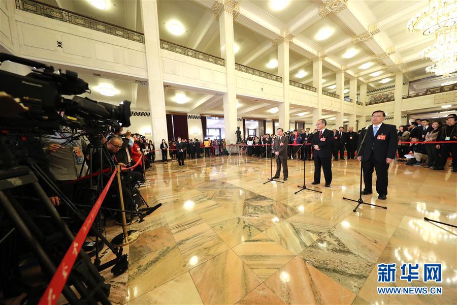 3月5日,第十三届全国人民代表大会第二次会议在北京人民大会堂开幕。这是全国人大代表高开贤、林少春、谭耀宗(从左至右)在“代表通道”接受采访。 新华社记者殷刚摄