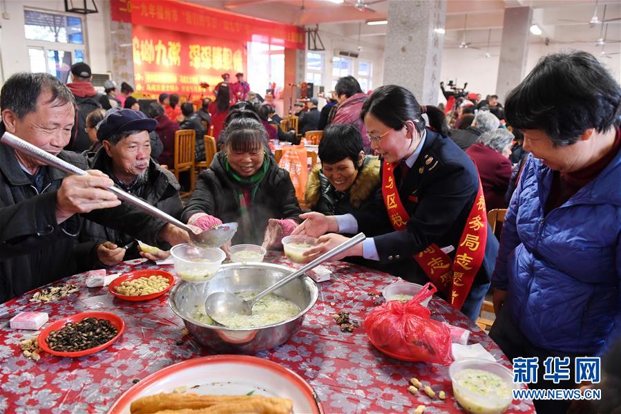 3月5日,志愿者在闽安村老人活动中心为老人送拗九粥。当日是福州市特有的传统节日“拗九节”,又称“孝顺节”。全国敬老模范村福州市马尾区闽安村举办了“我们的节日·拗九”活动,为老人送拗九粥、福寿围巾、表演闽剧等。新华社记者 林善传 摄
