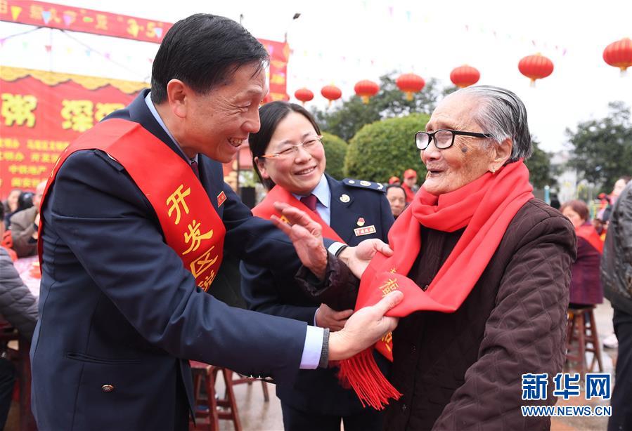 3月5日,志愿者为闽安村93岁的老人余秀英(右一)送上福寿围巾。当日是福州市特有的传统节日“拗九节”,又称“孝顺节”。全国敬老模范村福州市马尾区闽安村举办了“我们的节日·拗九”活动,为老人送拗九粥、福寿围巾、表演闽剧等。新华社记者 林善传 摄