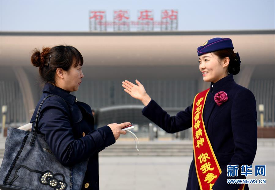 3月5日,在石家庄站广场,中国铁路北京局集团有限公司京铁列服公司石家庄分公司高铁餐吧部的工作人员在引导一名旅客前往候车位置。