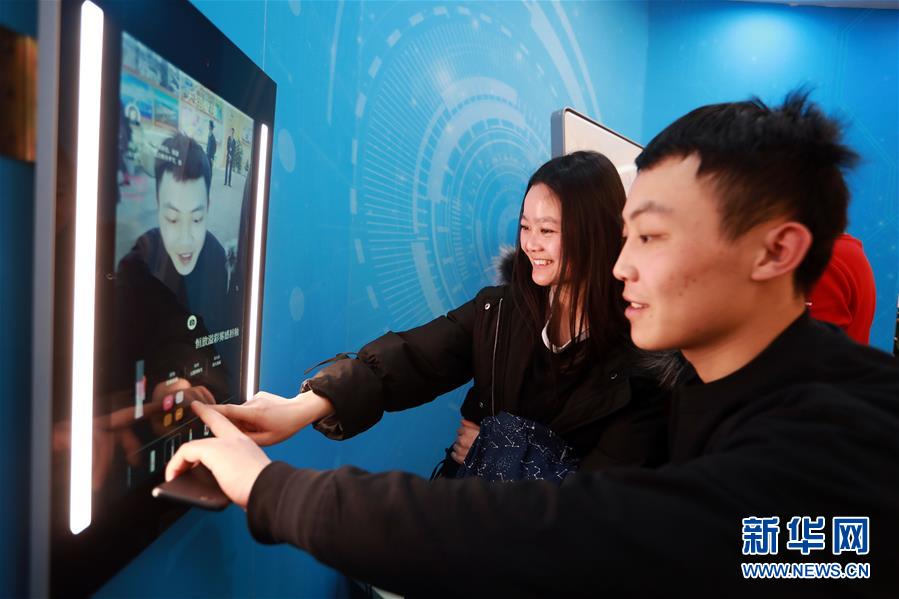 3月5日,参观者在展览上体验“天猫魔镜和试妆镜”。 截至3月5日,在北京中国国家博物馆举办的“伟大的变革——庆祝改革开放40周年大型展览”累计现场观众达3982195人次。 新华社记者 潘旭 摄