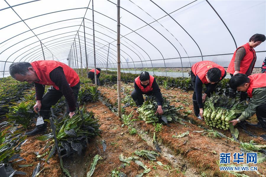 3月6日,东林镇的党员志愿者在大棚里帮助菜农收割莴笋。近日,当地天气转晴气温升高,浙江省湖州市吴兴区东林镇东方村的300多亩大棚内种植的莴笋集中成熟,平均每天采收6000多斤,市场销售行情很好。为了帮助菜农尽快抢收莴笋,东林镇的党员志愿者组成小分队进入大棚,帮助菜农抢收、搬运。 新华社记者徐昱摄
