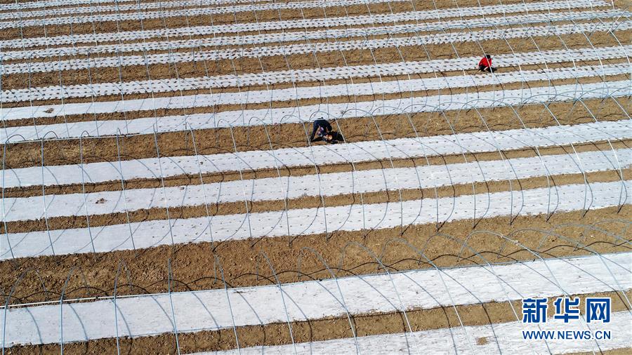 3月6日,江苏省灌云县南岗乡岗东村农民在田间劳作(无人机拍摄)。当日是二十四节气中的惊蛰,随着气温回升,各地农民忙着春耕春管,田间地头到处是一派忙碌景象。新华社发(吴晨光 摄)