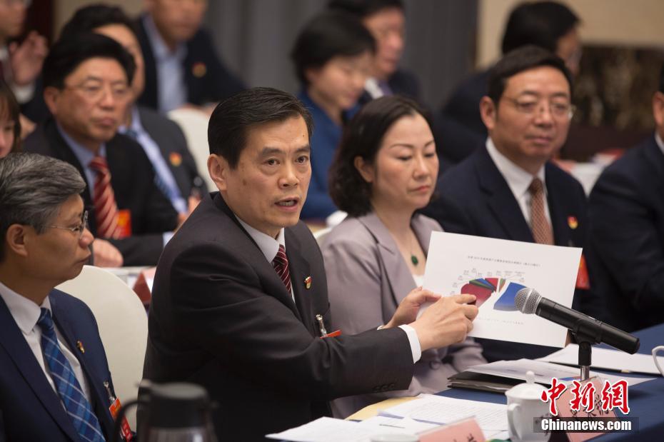 3月6日,十三届全国人大二次会议河南省代表团举行全体会议,审议李克强总理所作的政府工作报告,并向中外媒体开放。图为全国人大代表、河南省扶贫开发办公室主任史秉锐(左二)回答记者提问。中新社记者 王骏 摄